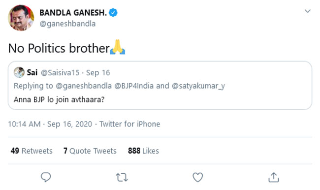 తాజాగా ఓ నెటిజన్ బండ్లకు ఓ అరుదైన ప్రశ్న వేశాడు. ‘బండ్ల అన్నా.. నువ్వు మళ్లీ బీజేపీలో చేరుతున్నావా?’ అని ట్విట్టర్ లో అడడగా.. బండ్ల గణేష్ చేతులెత్తి దండం పెట్టే సింబల్ పెట్టి ‘నో పాలిటిక్స్ బ్రదర్’ అంటూ తేల్చేశాడు. ఇక రాజకీయాల్లోకి రాను అంటూ తేల్చిచెప్పారు.