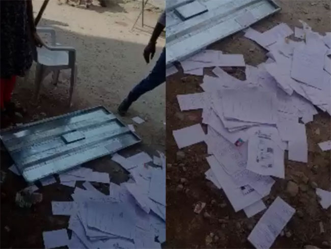 బూటు కాలితో టేబుళ్లను తన్నిన సీఐ .. పోలింగ్ బూత్ లో వీరంగం