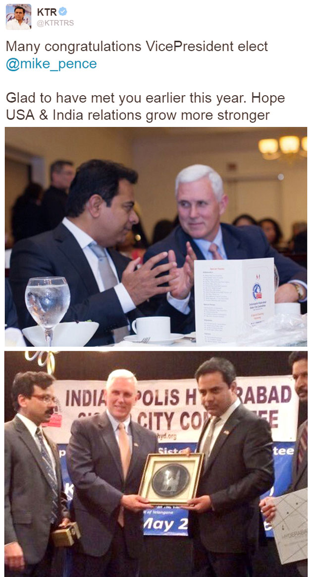 ఈ సందర్భంగా కాబోయే అధ్యక్షుడు ట్రంప్ కు - ఉపాధ్యక్షుడు మైక్ పేన్స్ కు కేటీఆర్ శుభాకాంక్షలు తెలిపారు. "ప్రపంచమంతా కొన్ని గంటలుగా ఉత్సుకతతో ఊగిపోతోంది. అమెరికాలో ట్రంప్ థండర్.. ఇండియాలో మోడీ సంచలన నిర్ణయం.. ప్రతి ఒక్కరినీ ఆశ్చర్యపర్చింది. మున్ముందు ఇలాంటి స్వీట్ షాక్ లు తప్పక చవిచూడాల్సి ఉంటుంది" అని కేటీఆర్ పేర్కొన్నారు. ఈ సందర్భంగా అభినందనలతోపాటు... ట్రంప్ - మైక్ పేన్స్ విజయంతో అమెరికా - భారత్ ల బంధం మరింత బలోపేతం కావాలని కోరుకుంటున్నట్లు కేటీఆర్ తెలిపారు.