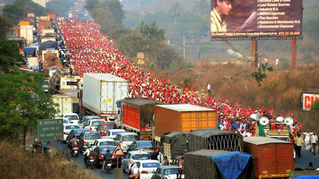ఇలా చేరుకున్న వారు వందో.. వెయ్యో కాదు.. ఏకంగా 35 వేల మంది. ఐదు రోజుల పాటు నడిచి ముంబయి చేరుకున్న వారి కారణంగా మహారాష్ట్ర ప్రభుత్వం గుండెల్లో రైళ్లు పరిగెడుతున్నాయి. ఏ క్షణంలో ఏం జరుగుతుందో అర్థం కాని పరిస్థితి నెలకొంది. అఖిల భారత కిసాన్ సభ ఆధ్వర్యంలో పంట రుణాల మాఫీ ప్రధాన డిమాండ్ గా.. గిట్టుబాటు ధర కల్పించాలని.. పండించిన పంటను ప్రభుత్వమే కొనుగోలు చేయాలని.. ఎరువులు పరుగు మందులకు సబ్సిడీ ఇప్పించాలని కోరుతూ వేలాది రైతులు మహారాష్ట్ర అసెంబ్లీని ముట్టడించేందుకు ముంబయికి చేరుకున్నారు.