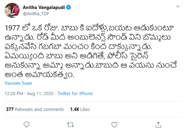 By: Tupaki Desk | 12 Aug 2020 11:00 AM ISTవైసీపీ పేరు చెబితే టీడీపీ మహిళా నేత వంగలపూడి అనిత అంతెత్తున లేస్తారు. తాజాగా, 1977లో బాబు అని ఆసక్తికర కామెంట్స్ చేశారు. దీనిపై నెటిజన్లు కూడా తమదైన శైలిలో స్పందించారు. 1977లో ఓ రోజు 5 ఏళ్ల వయస్సున్న బాబు బయట ఆడుకుంటున్నారని, ఇంతలో రోడ్డు మీద అంబులెన్స్ శబ్ధం విని, తన చేతిలోని బొమ్మలు పడేసి, ఇంట్లోకి పరుగెత్తి దాక్కున్నాడని, ఏమయిందని తల్లి అడిగితే పోలీస్ సైరన్గా భావించినట్లు చెప్పాడని, బాబుది ఆ వయస్సు నుండే అంత అమాయకత్వమని అనిత ట్వీట్ చేశారు.