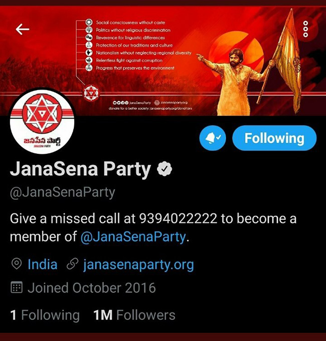 కొద్దినెలల్లోనే ట్విట్టర్లో జనసేన పార్టీ ఫాలోయింగ్ బాగా పెరిగింది. తాజాగా జనసేన పార్టీ అఫీషియల్ పేజీ ఒక రికార్డును కైవసం చేసుకుంది. ఏకంగా మిలియన్ ట్విట్టర్ ఫాలోవర్లను సంపాదించుకున్న తొలి పార్టీగా రికార్డును అందుకుంది. ఏపీలో అధికారంలో ఉన్న వైసీపీకి 5.6 లక్షల మంది మాత్రమే ఫాలోవర్లు ఉండడం గమనార్హం.ఇక మీడియాను, సోషల్ మీడియాను బాగా మేనేజ్ చేసే తెలుగుదేశం పార్టీకి ఫాలోవర్స్ కేవలం 4 లక్షలే కావడం గమనార్హం.