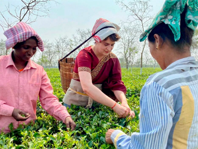 ఇప్పుడు ప్రియాంక వంతు.. తాజాగా ఈశాన్య రాష్ట్రం అసోంలో ఎన్నికల ప్రచార బాధ్యతలను ప్రియాంక తీసుకున్నారు. అక్కడ ఎక్కువ సంఖ్యలో ఉండి ఓటింగ్ ప్రభావితం చేసే తేయాకు కార్మికులను కలిసి వారిలాగా తట్టాబుట్టా పట్టుకొని తేయాకు కూలీగా మారి ఆకులు ఏరారు. ఈ ఫొటోలు షేర్ చేయడంతో వైరల్ అయ్యాయి.
