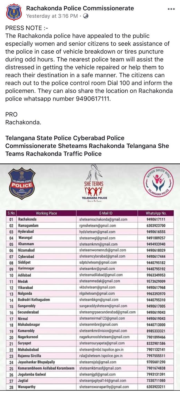 ఈ నేపథ్యంలో ఇలాంటి ఇబ్బందులు తలెత్తకుండా ఉండేందుకు వీలుగా రాచకొండ పోలీసు కమిషనరేట్ స్పందించింది. రాత్రి వేళలో మహిళలు.. సీనియర్ సిటిజన్లు ఎవరైనా తాము ప్రయాణిస్తున్న వాహనాలు చెడిపోయినా.. పంక్చర్ పడినా.. ఆగిపోయినా.. ఎలాంటి ఇబ్బందులు ఎదురైనా వెంటనే తమను సంప్రదించాలని కోరుతూ ఫోన్ నెంబర్లను జారీ చేశారు.