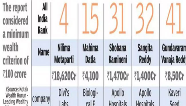 ఇక.. ఈ జాబితాలో రాజకీయ కుటుంబంగా ఉన్న వారెవరన్నది చూస్తే.. ఏపీ మాజీ ముఖ్యమంత్రిచంద్రబాబు సతీమణి నారా భువనేశ్వరి ఒక్కరు మాత్రమే నిలుస్తారు.ఆమె సంపద రూ.400 కోట్లుగా తేల్చారు. తెలుగు రాష్ట్రాలకు చెందిన అత్యంత సంపన్న మహిళలు.. వారి ఆస్తి.. వారే కంపెనీకి చెందిన వారన్న వివరాల్ని చూస్తే..