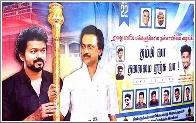 తమిళనాడులోని దిండుక్కల్ ప్రాంతానికి చెందిన విజయ్ అభిమాన సంఘం సభ్యులు తయారు చేయించిన ఈ ఫ్లెక్సీలో.. విజయ్ తోపాటు తమిళనాడు సీఎం స్టాలిన్ ఫొటోను కూడా ఉంచడం వివాదాస్పదమైంది. అంతేకాదు.. స్టాలిన్ తన చేతిలోని రాజదండాన్ని విజయ్ కు అందిస్తున్నట్టుగా ఏర్పాటు చేశారు.