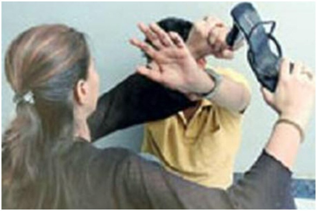 పోలీసుల ముందే భర్తను చితక్కొట్టింది